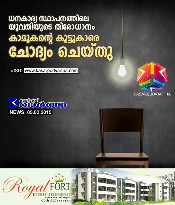 കാഞ്ഞങ്ങാട്: (www.kasargodvartha.com 05/02/2015) ധനകാര്യ സ്ഥാപനത്തിലെ യുവതിയുടെ തിരോധാനവുമായി ബന്ധപ്പെട്ട് കാമുകനായ യുവാവിന്റെ കൂട്ടുകാരെ പോലീസ് ചോദ്യം ചെയ്തു. പടന്നക്കാട് ഒഴിഞ്ഞവളപ്പിലെ ഷംസീറയുടെ തിരോധാനവുമായി ബന്ധപ്പെട്ടാണ് നീലേശ്വരം സ്വദേശിയായ വിജേഷിന്റെ കൂട്ടുകാരെ പോലീസ് ചോദ്യം ചെയ്തത്.