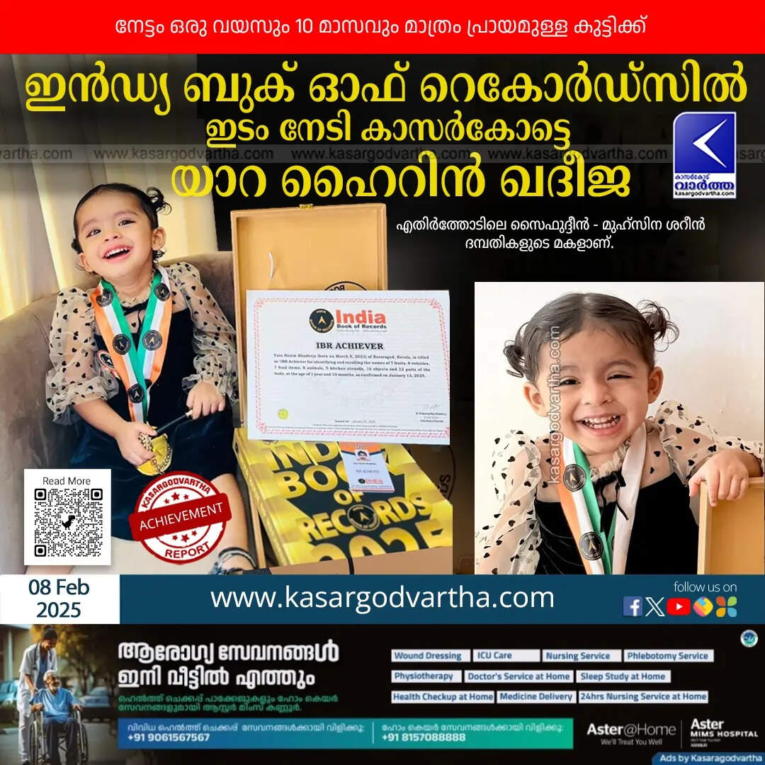 Prodigy | ഇൻഡ്യ ബുക് ഓഫ് റെകോർഡ്സിൽ ഇടം നേടി കാസർകോട്ടെ യാറ ഹൈറിൻ ഖദീജ