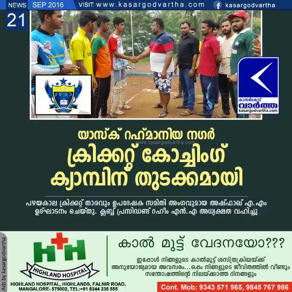 യാസ്ക് റഹ് മാനിയ നഗര് ക്രിക്കറ്റ് കോച്ചിംഗ് ക്യാമ്പിന് തുടക്കമായി