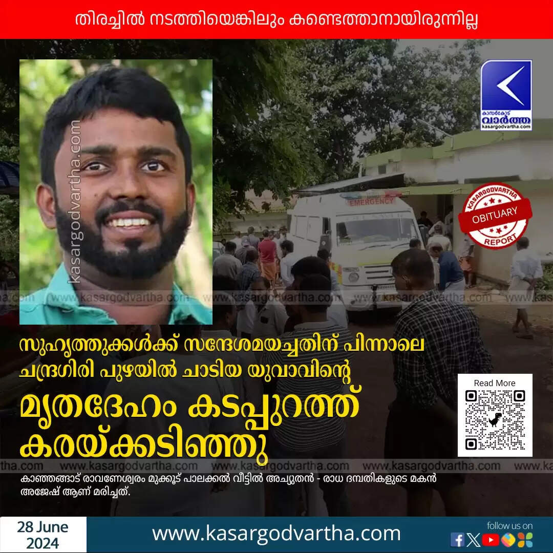 Dead Body | സുഹൃത്തുക്കള്ക്ക് സന്ദേശമയച്ചതിന് പിന്നാലെ ചന്ദ്രഗിരി പുഴയിൽ ചാടിയ യുവാവിൻ്റെ മൃതദേഹം കടപ്പുറത്ത് കരയ്ക്കടിഞ്ഞു