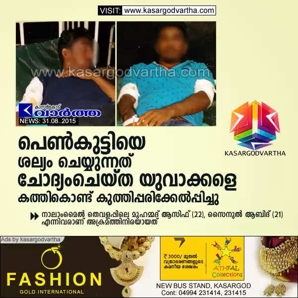 കാസര്‍കോട്: (www.kasargodvartha.com 31/08/2015) പെണ്‍കുട്ടിയെ ശല്യം ചെയ്യുന്നതിനെ ചോദ്യംചെയ്ത നാട്ടുകാരായ യുവാക്കളെ കത്തികൊണ്ട് കുത്തി പരിക്കേല്‍പ്പിച്ചു. നാലാംമൈല്‍ തെവളപ്പിലെ മുഹമ്മദ് ആസിഫ് (22), സൈനുല്‍ ആബിദ് (21) എന്നിവരാണ് അക്രമത്തിനിരയായത്.