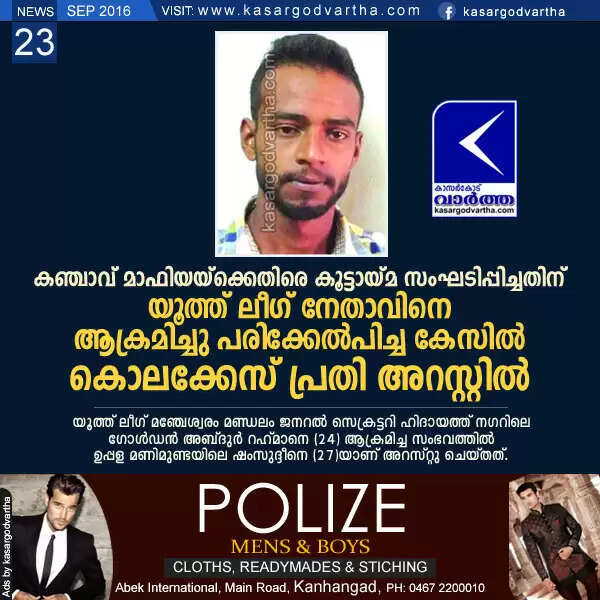 Keywords: Kasaragod, Kerala, Manjeshwaram, Youth, Youth League, Ganja, Attack, Assault, case, complaint, Investigation, arrest, Youth arrested for assaulting youth league leader.