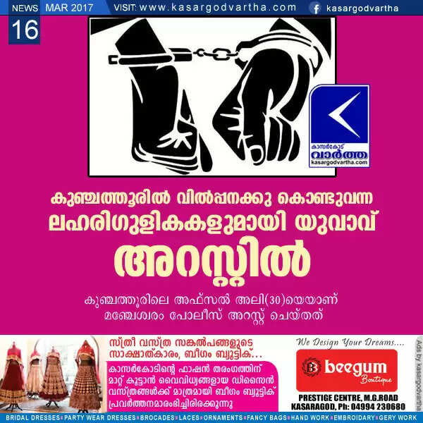 മഞ്ചേശ്വരം: (www.kasargodvartha.com 16.03.2017) കുഞ്ചത്തൂരില്‍ വില്‍പ്പനക്കു കൊണ്ടുവന്ന ലഹരി ഗുളികകളുമായി യുവാവിനെ പോലീസ് അറസ്റ്റ് ചെയ്തു. കുഞ്ചത്തൂരിലെ അഫ്സല്‍ അലി(30)യെയാണ് മഞ്ചേശ്വരം പോലീസ് അറസ്റ്റ് ചെയ്തത്.