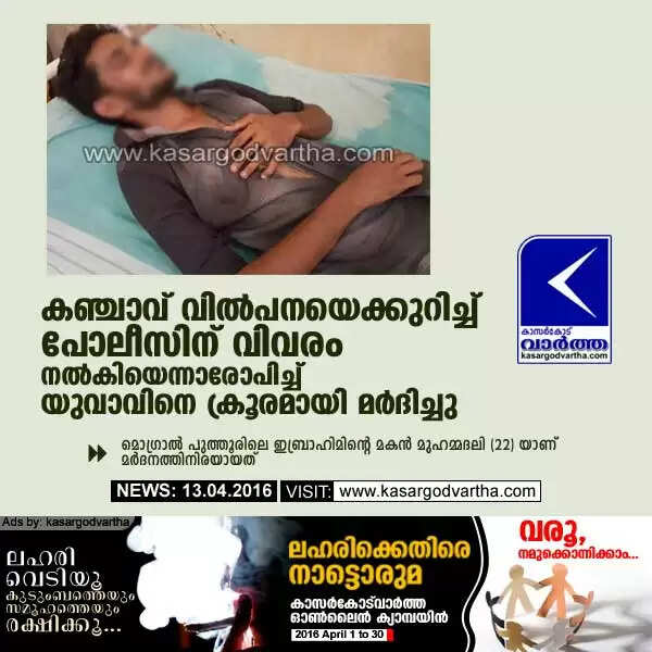 കാസര്‍കോട്: (www.kasargodvartha.com 13/04/2016) കഞ്ചാവ് വില്‍പനയെ കുറിച്ച് പോലീസിന് വിവരം നല്‍കിയെന്നാരോപിച്ച് യുവാവിനെ മൂന്നംഗ സംഘം ക്രൂരമായി തല്ലിച്ചതച്ചു. മൊഗ്രാല്‍ പുത്തൂരിലെ ഇബ്രാഹിമിന്റെ മകന്‍ മുഹമ്മദലി (22) യാണ് മര്‍ദനത്തിനിരയായത്.