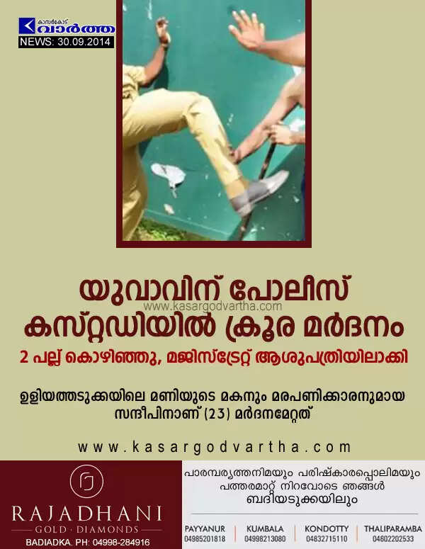 കാസര്കോട്: (www.kasargodvartha.com 30.09.2014) കാസര്കോട്ട് യുവാവിന് പോലീസ് കസ്റ്റഡിയില് ക്രൂര മര്ദനം. രണ്ട് പല്ല് കൊഴിഞ്ഞു. പോലീസ് യുവാവിനെ കോടതിയില് ഹാജരാക്കിയെങ്കിലും മജിസ്ട്രേറ്റ് ചികിത്സനല്കാന് കാസര്കോട് ജനറല് ആശുപത്രിയില് പ്രവേശിപ്പിക്കാന് ഉത്തരവിട്ടു. ഉളിയത്തടുക്കയിലെ മണിയുടെ മകനും മരപണിക്കാരനുമായ സന്ദീപിനാണ് (23) മര്ദനമേറ്റത്.