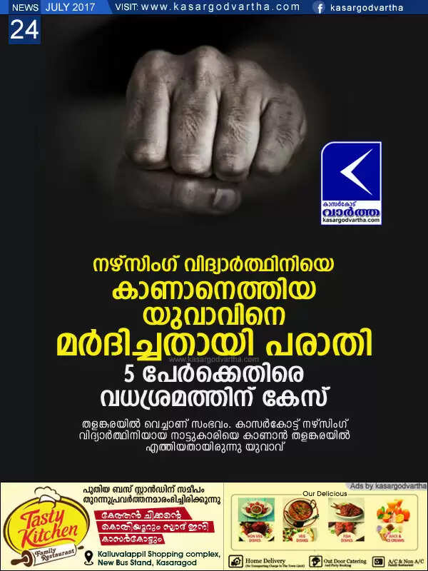 നഴ്സിംഗ് വിദ്യാര്ത്ഥിനിയെ കാണാനെത്തിയ യുവാവിനെ മര്ദിച്ചതായി പരാതി; 5 പേര്ക്കെതിരെ വധശ്രമത്തിന് കേസ്