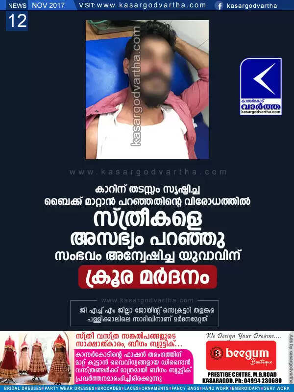 കാസര്‍കോട്: (www.kasargodvartha.com 12.11.2017) കാറിന് തടസ്സം സൃഷ്ടിച്ച ബൈക്ക് മാറ്റാന്‍ പറഞ്ഞതിന്റെ വിരോധത്തില്‍ സ്ത്രീകളെ അസഭ്യം പറഞ്ഞു. സംഭവം അന്വേഷിച്ച യുവാവിനെ ഇതേസംഘം ക്രൂരമായി മര്‍ദിച്ചു. ജി എച്ച് എം ജില്ലാ ജോയിന്റ് സെക്രട്ടറി തളങ്കര പള്ളിക്കാലിലെ സാദിഖിനാ (37) ണ് മര്‍ദനമേറ്റത്. ഞായറാഴ്ച രാത്രി 9.15 മണിയോടെ പതിക്കുന്ന് മുണ്ടപ്പതി റോഡിലാണ് സംഭവം.