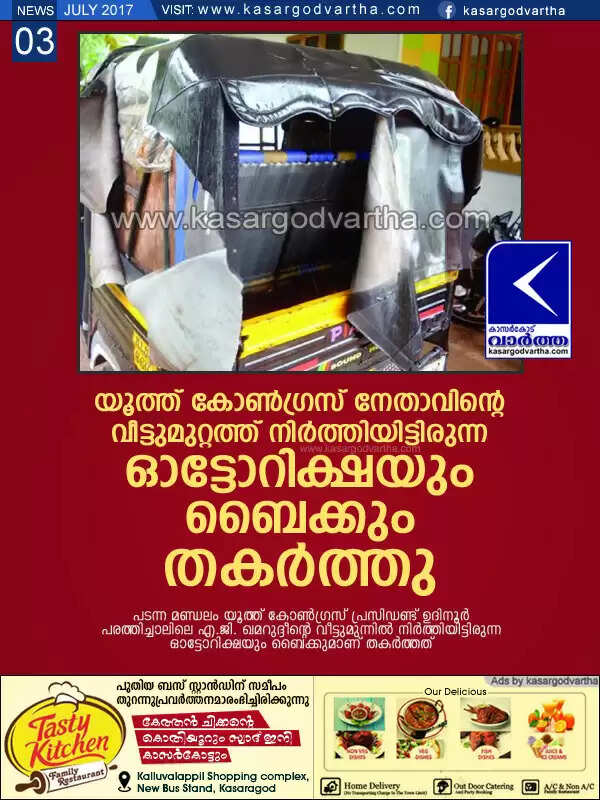 Keywords: Kasaragod, Kerala, Trikaripur, news, youth-congress, Leader, complaint, chandera, Police, Youth congress leader's Auto Rikshaw attacked