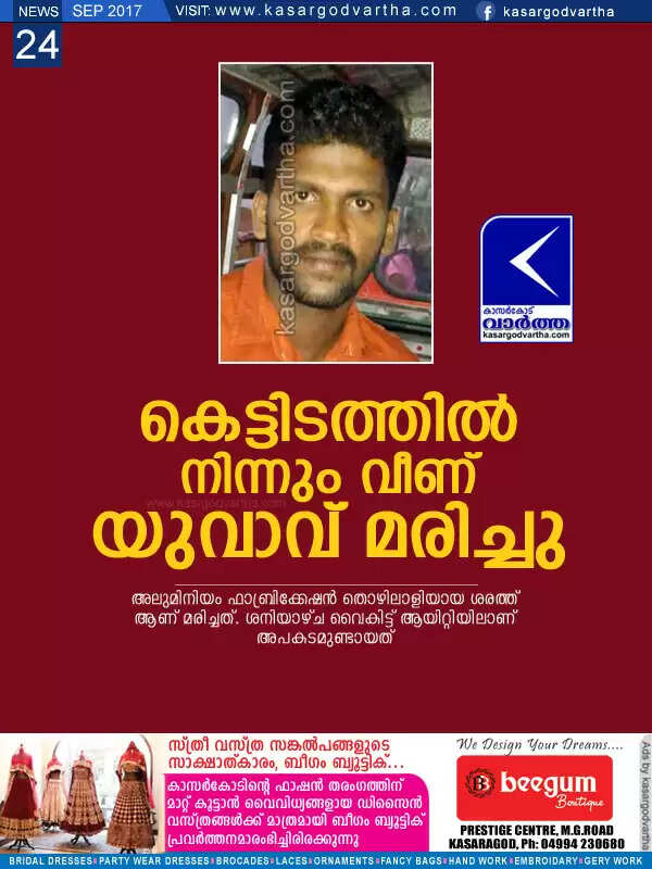 തൃക്കരിപ്പൂര്‍: (www.kasargodvartha.com 24.09.2017) നിര്‍മ്മാണ പ്രവര്‍ത്തിക്കിടെ കെട്ടിടത്തില്‍ നിന്നും വീണ് യുവാവ് മരിച്ചു. കുത്തുപറമ്പ് മൂരിയാട്പാറയിലെ കാനാനെറ്റ വീട്ടില്‍ എ.പി ശരത്ത് (24) ആണ് മരിച്ചത്. അലുമിനിയം ഫാബ്രിക്കേഷന്‍ തൊഴിലാളിയാണ്. ശനിയാഴ്ച വൈകിട്ട് നാലു മണിയോടെയാണ് അപകടമുണ്ടായത്.
