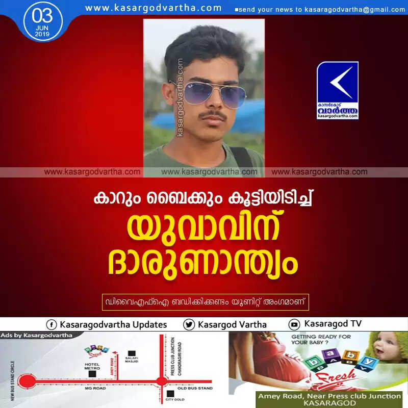 Keywords: Kerala, Kasaragod, Kundamkuzhi, News, Accident, Youth, Death, Accidental-Death, Car, Bike, Youth dies in accident.