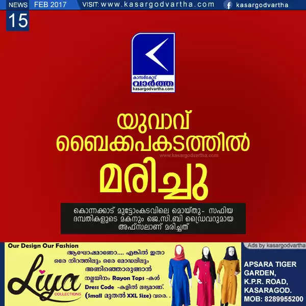 Keywords: Kasaragod, Kerala, Death, Accidental-Death, Bike-Accident, Youth dies in accident.