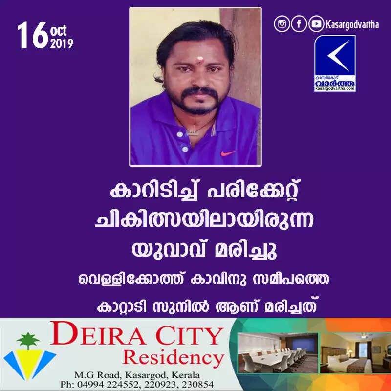 കാഞ്ഞങ്ങാട്: (www.kasargodvartha.com 16.10.2019) കാറിടിച്ച് പരിക്കേറ്റ് ചികിത്സയിലായിരുന്ന യുവാവ് മരിച്ചു. വെള്ളിക്കോത്ത് കാവിനു സമീപത്തെ രഘു-നാരായണി ദമ്പതികളുടെ മകന് കാറ്റാടി സുനില് (37) ആണ് മരിച്ചത്.