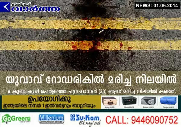 കുണ്ടംകുഴി: (www.kasargodvartha.com 01.06.2014) 33 കാരനെ റോഡരികില്‍ മരിച്ച നിലയില്‍ കണ്ടെത്തി. കുണ്ടംകുഴി പെര്‍ളത്തെ ചന്ദ്രഹാസനെയാണ് ശനിയാഴ്ച ഉച്ചയ്ക്ക് കുണ്ടംകുഴി ഹയര്‍സെക്കണ്ടറി സ്‌കൂളിനടുത്ത സ്വകാര്യ പറമ്പിലെ റോഡില്‍ മരിച്ച നിലയില്‍ കണ്ടെത്തിയത്. ശനിയാഴ്ച രാവിലെ ഇയാളെ അവശനിലയില്‍ റോഡരികില്‍ കിടക്കുന്നത് നാട്ടുകാര്‍ കണ്ടെത്തിയിരുന്നു.