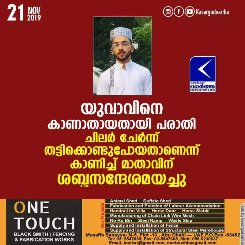 യുവാവിനെ കാണാതായതായി പരാതി; ചിലര് ചേര്ന്ന് തട്ടിക്കൊണ്ടുപോയതാണെന്ന് കാണിച്ച് മാതാവിന് ശബ്ദസന്ദേശമയച്ചു