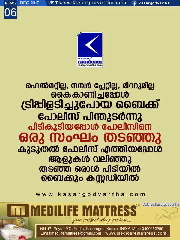 ഹെല്മറ്റില്ല, നമ്പര് പ്ലേറ്റില്ല, മിററുമില്ല; കൈകാണിച്ചപ്പോള് ട്രിപ്പിളടിച്ചുപോയ ബൈക്ക് പോലീസ് പിന്തുടര്ന്നു, പിടികൂടിയപ്പോള് പോലീസിനെ ഒരു സംഘം തടഞ്ഞു, കൂടുതല് പോലീസ് എത്തിയപ്പോള് ആളുകള് വലിഞ്ഞു, തടഞ്ഞ ഒരാള് പിടിയില്, ബൈക്കും കസ്റ്റഡിയില്
