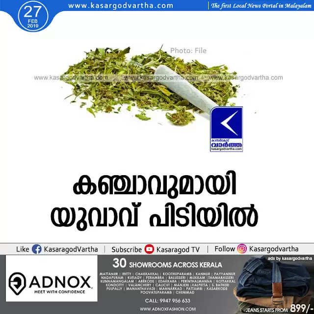 Keywords:  Kasaragod, Kerala, news, Ganja, Ganja seized, arrest, Police, Youth held with Ganja