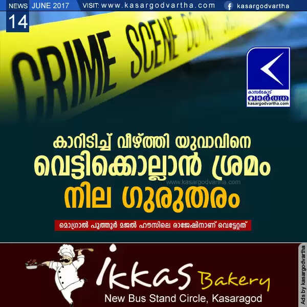 കാസര്‍കോട്: (www.kasargodvartha.com 14.06.2017) ഇന്നോവ കാറിടിച്ച് വീഴ്ത്തിയ ശേഷം യുവാവിനെ വെട്ടിക്കൊല്ലാന്‍ ശ്രമിച്ചു. മൊഗ്രാല്‍ പുത്തൂര്‍ മജല്‍ ഹൗസിലെ വിജയന്റെ മകന്‍ രാജേഷിനെ (35) യാണ് വെട്ടിക്കൊല്ലാന്‍ ശ്രമിച്ചത്. ബുധനാഴ്ച രാത്രി 10 മണിയോടെ ചൗക്കിയില്‍ വെച്ചാണ് സംഭവം.
