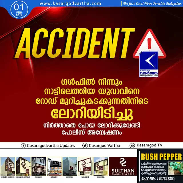 ഗള്ഫില് നിന്നും നാട്ടിലെത്തിയ യുവാവിനെ റോഡ് മുറിച്ചുകടക്കുന്നതിനിടെ ലോറിയിടിച്ചു; നിര്ത്താതെ പോയ ലോറിക്കുവേണ്ടി പോലീസ് അന്വേഷണം