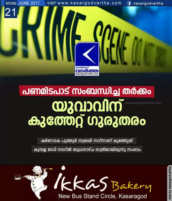 കുമ്പള: (www.kasargodvartha.com 21.06.2017) കുമ്പളയില് യുവാവിന് കുത്തേറ്റ് ഗുരുതരമായി പരിക്കേറ്റു. കര്ണാടക പുത്തൂര് സ്വദേശി നവീനാണ് (31) കുത്തേറ്റത്. കുമ്പള ദേവി നഗറില് ബുധനാഴ്ച രാത്രിയായിരുന്നു സംഭവം.