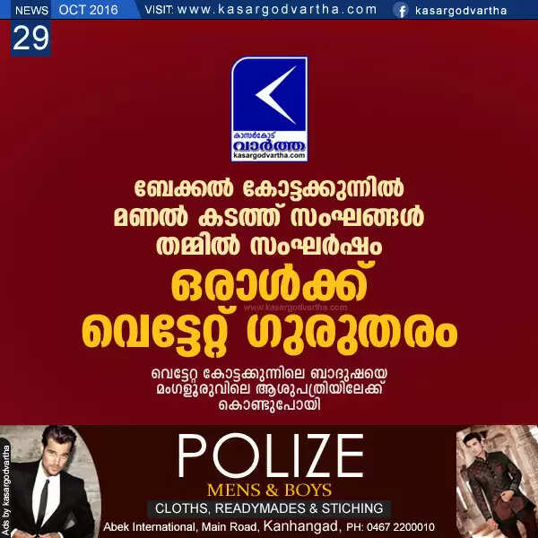 ബേക്കല്: (www.kasargodvartha.com 29/10/2016) കോട്ടക്കുന്നില് മണല് കടത്ത് സംഘങ്ങള് തമ്മിലുള്ള സംഘര്ഷത്തില് ഒരാള്ക്ക് വെട്ടേറ്റു. വെട്ടേറ്റ കോട്ടക്കുന്നിലെ ബാദുഷയെ മംഗളൂരുവിലെ ആശുപത്രിയിലേക്ക് കൊണ്ടുപോയി. കത്തി അഷ്റഫ് എന്നയാളാണ് ബാദുഷയെ വെട്ടിയതെന്നാണ് പോലീസിന് ലഭിച്ചിരിക്കുന്ന വിവരം. സംഘര്ഷത്തില് പരിക്കേറ്റ രണ്ടു പേരെ കാഞ്ഞങ്ങാട്ടെ ആശുപത്രിയിലേക്ക് കൊണ്ടുപോയിട്ടുണ്ട്.