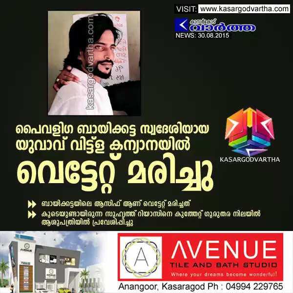വിട്ടൽ: (www.kasargodvartha.com 30/08/2015) പൈവളിഗെ ബായിക്കട്ട സ്വദേശിയായ യുവാവ് വിട്ട്ള പോലീസ് സ്റ്റേഷന് പരിധിയില് പെട്ട കന്യാനയില് വെട്ടേറ്റു മരിച്ചു. ബായിക്കട്ടയിലെ ആസിഫ് (35) ആണ് വെട്ടേറ്റ് മരിച്ചത്. കൂടെയുണ്ടായിരുന്ന സുഹൃത്ത് റിയാസിനെ (30) കുത്തേറ്റ് ഗുരുതര നിലയില് ആശുപത്രിയില് പ്രവേശിപ്പിച്ചു. www.kasargodvartha.com