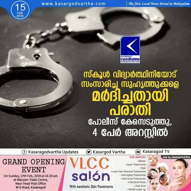 സ്കൂള് വിദ്യാര്ത്ഥിനിയോട് സംസാരിച്ച സുഹൃത്തുക്കളെ മര്ദിച്ചതായി പരാതി; പോലീസ് കേസെടുത്തു, 4 പേര് അറസ്റ്റില്