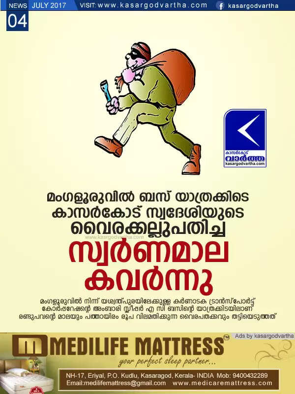 മംഗളൂരുവില് ബസ് യാത്രക്കിടെ കാസര്കോട് സ്വദേശിയുടെ വൈരക്കല്ലുപതിച്ച സ്വര്ണമാല കവര്ന്നു