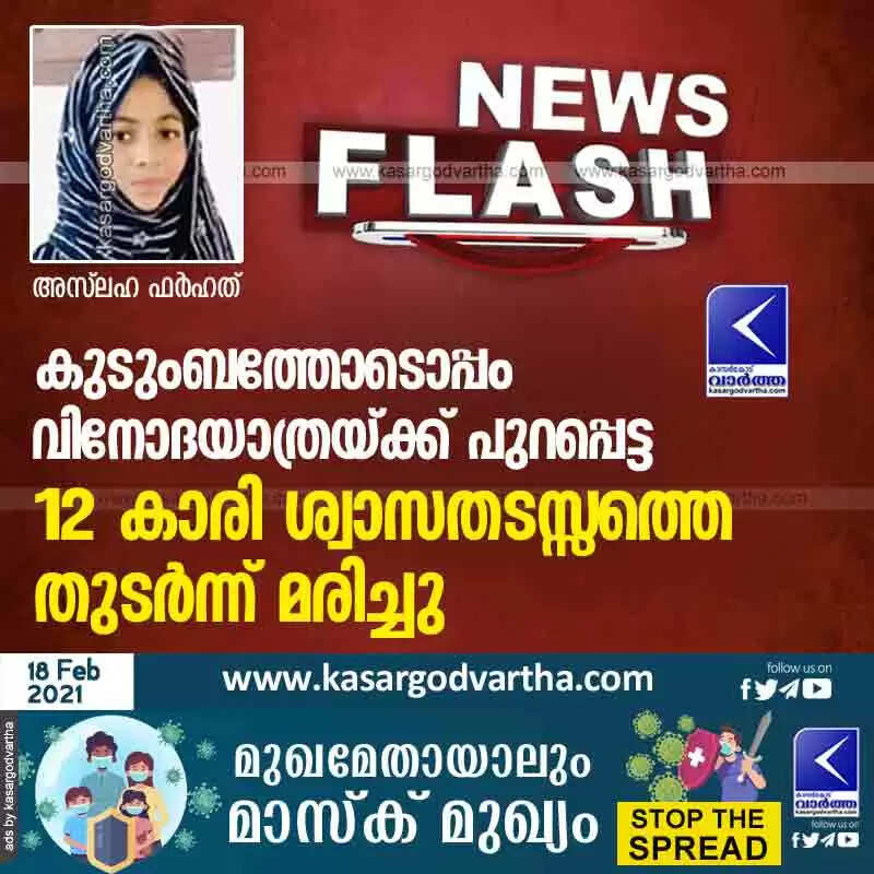 കുടുംബത്തോടൊപ്പം വിനോദയാത്രയ്ക്ക് പുറപ്പെട്ട 12 കാരി ശ്വാസതടസ്സത്തെ തുടര്ന്ന് മരിച്ചു