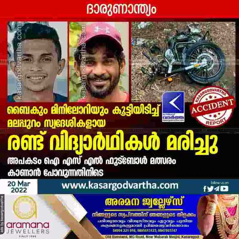 ബൈകും മിനിലോറിയും കൂട്ടിയിടിച്ച് മലപ്പുറം സ്വദേശികളായ രണ്ട് വിദ്യാർഥികൾ മരിച്ചു; അപകടം ഐ എസ് എല്‍ ഫുട്‍ബോൾ മത്സരം കാണാന്‍ പോവുന്നതിനിടെ