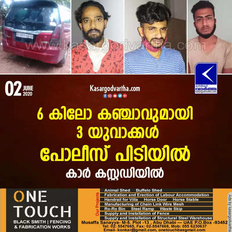 6 കിലോ കഞ്ചാവുമായി 3 യുവാക്കള് പോലീസ് പിടിയില്; കാര് കസ്റ്റഡിയില്
