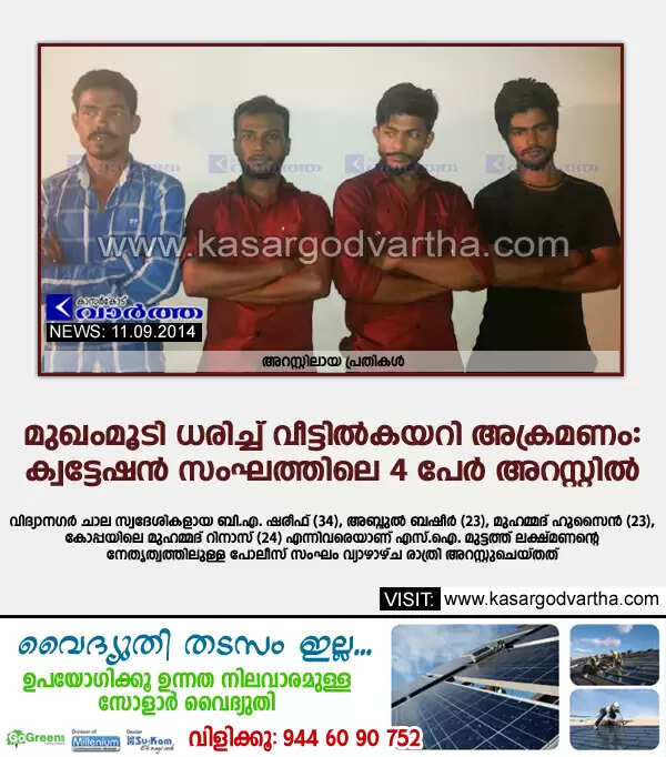 മുഖംമൂടി ധരിച്ച് വീട്ടില്കയറി അക്രമണം: ക്വട്ടേഷന് സംഘത്തിലെ 4 പേര് അറസ്റ്റില്