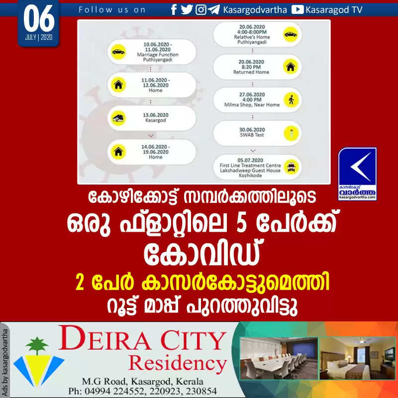 കോഴിക്കോട്ട് സമ്പര്‍ക്കത്തിലൂടെ ഒരു ഫ്‌ളാറ്റിലെ 5 പേര്‍ക്ക് കോവിഡ്; 2 പേര്‍ കാസര്‍കോട്ടുമെത്തി, റൂട്ട് മാപ്പ് പുറത്തുവിട്ടു