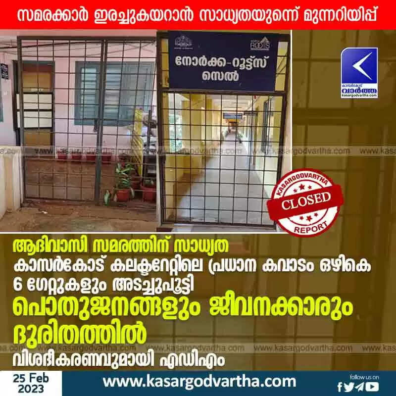 Closed | ആദിവാസി സമരത്തിന് സാധ്യത; കാസർകോട് കലക്ടറേറ്റിലെ പ്രധാന കവാടം ഒഴികെ 6 ഗേറ്റുകളും അടച്ചുപൂട്ടി; പൊതുജനങ്ങളും ജീവനക്കാരും ദുരിതത്തിൽ; വിശദീകരണവുമായി എഡിഎം