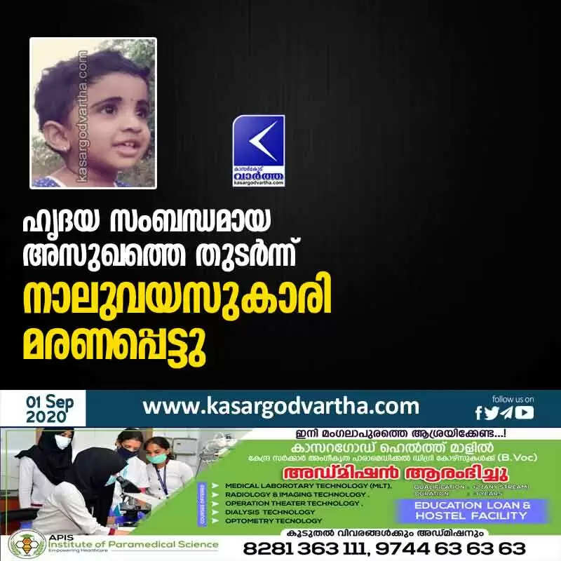 ഹൃദയ സംബന്ധമായ അസുഖത്തെ തുടർന്ന് നാലുവയസുകാരി മരണപ്പെട്ടു