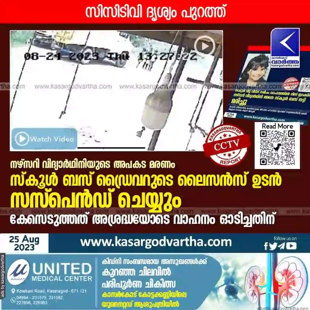 Accident | നഴ്‌സറി വിദ്യാർഥിനിയുടെ അപകട മരണം: സ്‌കൂൾ ബസ് ഡ്രൈവറുടെ ലൈസൻസ് ഉടൻ സസ്‌പെൻഡ് ചെയ്യും; കേസെടുത്തത് അശ്രദ്ധയോടെ വാഹനം ഓടിച്ചതിന്; സിസിടിവി ദൃശ്യം പുറത്ത്