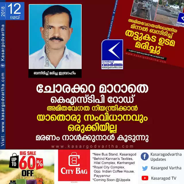 കാസര്കോട്: (www.kasargodvartha.com 12.05.2018) ചോരക്കറ മാറാതെ കെഎസ്ടിപി റോഡ്. അമിതവേഗതയെ നിയന്ത്രിക്കാന് യാതൊരു സംവിധാനവും ഇനിയും ഈ റോഡില് അധികൃതര് ഒരുക്കിയില്ല. അതുകൊണ്ടു തന്നെ മരണം നാള്ക്കുനാള് വര്ദ്ധിച്ചു വരികയാണ്. ശനിയാഴ്ച രാവിലെ ഏഴു മണിയോടെ അമിതവേഗതയില് ഓടിയ കെഎസ്ആര്ടിസി മിന്നല് ബസിടിച്ച് തട്ടുകട ഉടമ മരിച്ചുതാണ് ഈ റോഡിലെ ഒടുവിലത്തെ അപകട മരണം.
