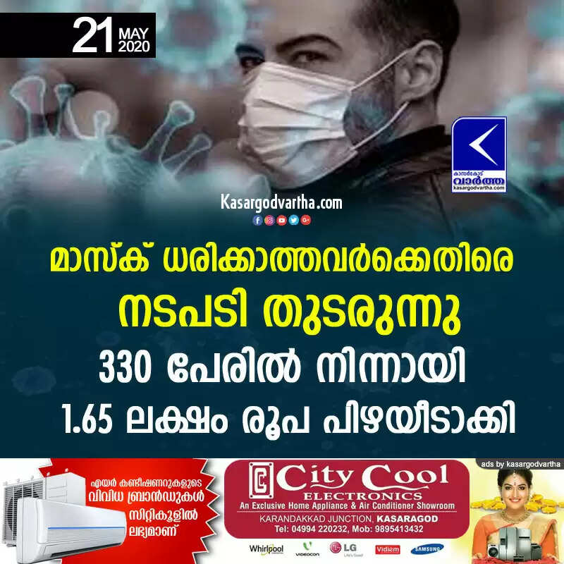 Keywords: Kasaragod, Kerala, News, COVID-19, Mask, Case, Police, Action against who not wear mask; 330 cases registered