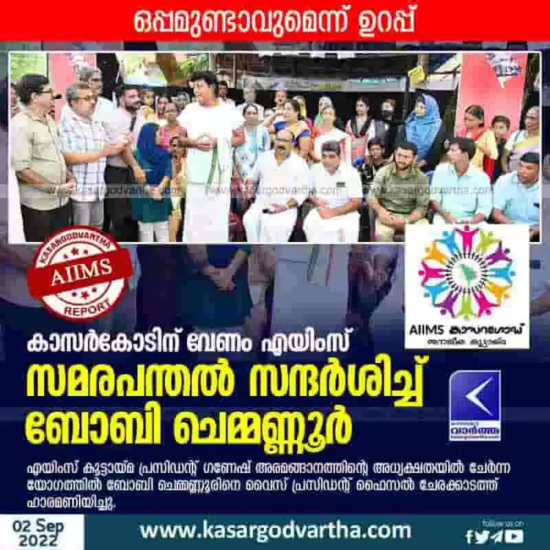 Bobby Chemmannur visited | കാസർകോടിന് വേണം എയിംസ്: സമരപന്തൽ സന്ദർശിച്ച് ബോബി ചെമ്മണ്ണൂർ; ഒപ്പമുണ്ടാവുമെന്ന് ഉറപ്പ്
