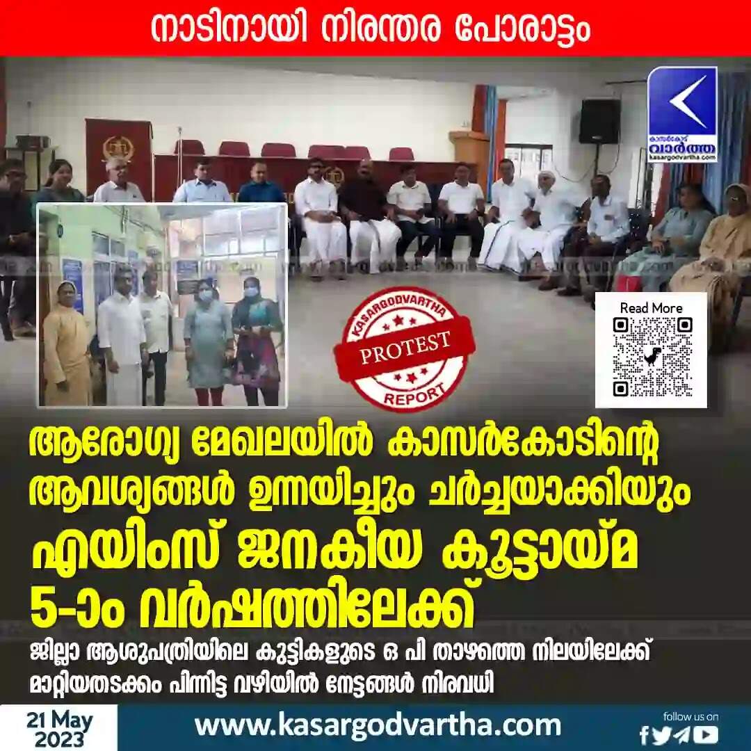Protest | നാടിനായി നിരന്തര പോരാട്ടം; ആരോഗ്യ മേഖലയില് കാസര്കോടിന്റെ ആവശ്യങ്ങള് ഉന്നയിച്ചും ചര്ച്ചയാക്കിയും എയിംസ് ജനകീയ കൂട്ടായ്മ 5-ാം വര്ഷത്തിലേക്ക്; ജില്ലാ ആശുപത്രിയിലെ കുട്ടികളുടെ ഒ പി താഴത്തെ നിലയിലേക്ക് മാറ്റിയതടക്കം പിന്നിട്ട വഴിയില് നേട്ടങ്ങള് നിരവധി