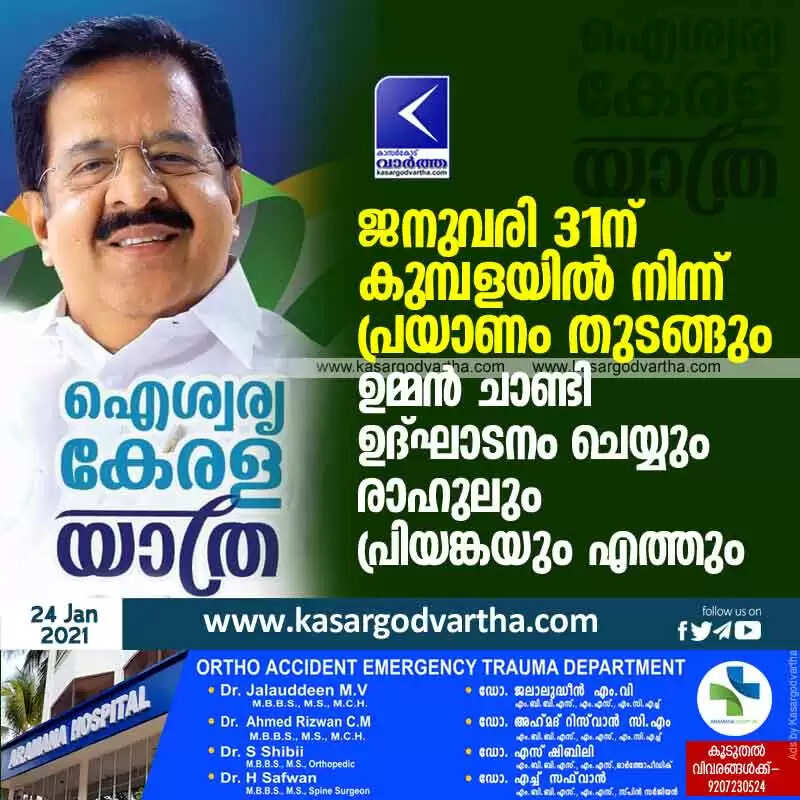 Keywords: Kasaragod, News, Kerala, Rahul Gandhi, Ramesh-Chennithala, Oommen Chandy, UDF, Kumbala, MLA, LDF, BJP, Political party, Aishwarya Kerala Yatra will start from Kumbala on January 31; Oommen Chandy will inaugurate; Rahul and Priyanka will arrive