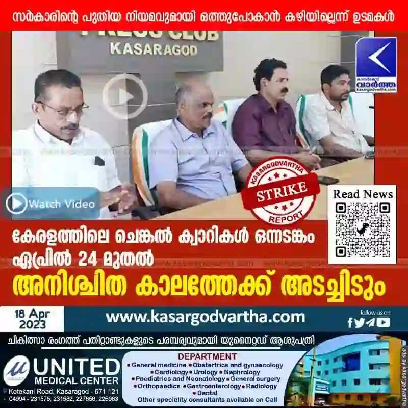 Keywords: Kasaragod, Kerala, News, Top-Headlines, Kasaragod-News, Strike, Government, Stone Quarries, All stone quarries in Kerala will be closed indefinitely from April 24.