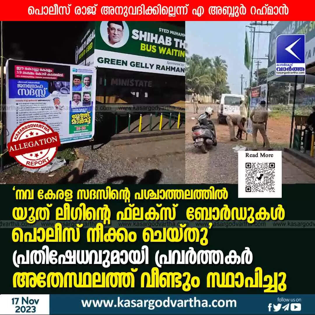 Allegation | 'നവ കേരള സദസിന്റെ പശ്ചാത്തലത്തിൽ യൂത് ലീഗിൻ്റെ ഫ്ലക്സ് ബോർഡുകൾ പൊലീസ് നീക്കം ചെയ്തു'; പ്രതിഷേധവുമായി പ്രവർത്തകർ; അതേസ്ഥലത്ത് വീണ്ടും സ്ഥാപിച്ചു; പൊലീസ് രാജ് അനുവദിക്കില്ലെന്ന് എ അബ്ദുർ റഹ്മാൻ