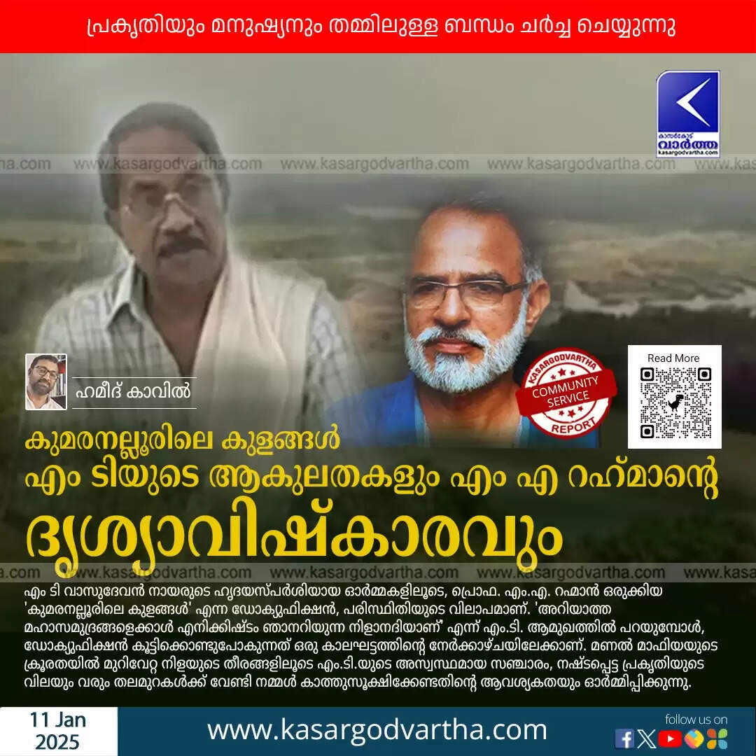 (KasargodVartha) മനുഷ്യമനസ്സിന്റെ വികാര വിചാര വൈരികളെ ഘനമാർന്ന വാക്കിലൂടെ കോറിയിട്ട എഴുത്തുകാരൻ എം ടി വാസുദേവൻ നായരുടെ ആകുലതകൾ ഒപ്പിയെടുത്ത മാനോഹര കാവ്യം പോലെയാണ് 'കുമരനല്ലൂരിലെ കുളങ്ങൾ' എന്ന ഡോക്യുഫിക്ഷൻ കേരളത്തിന്റെ പ്രിയപ്പെട്ട എഴുത്തുകാരൻ പ്രൊഫ. എം എ റഹ്മാൻ ഒരുക്കിയിരിക്കുന്നത്.
