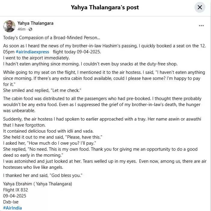 Mourning the loss of his brother-in-law, Yahya Thalangara shared a touching experience on his Dubai-Mangalore flight. An empathetic air hostess, named Ashwini or Ashwati, offered him her own food when he was hungry and upset, showcasing a beautiful act of human kindness that has been widely appreciated on social media.