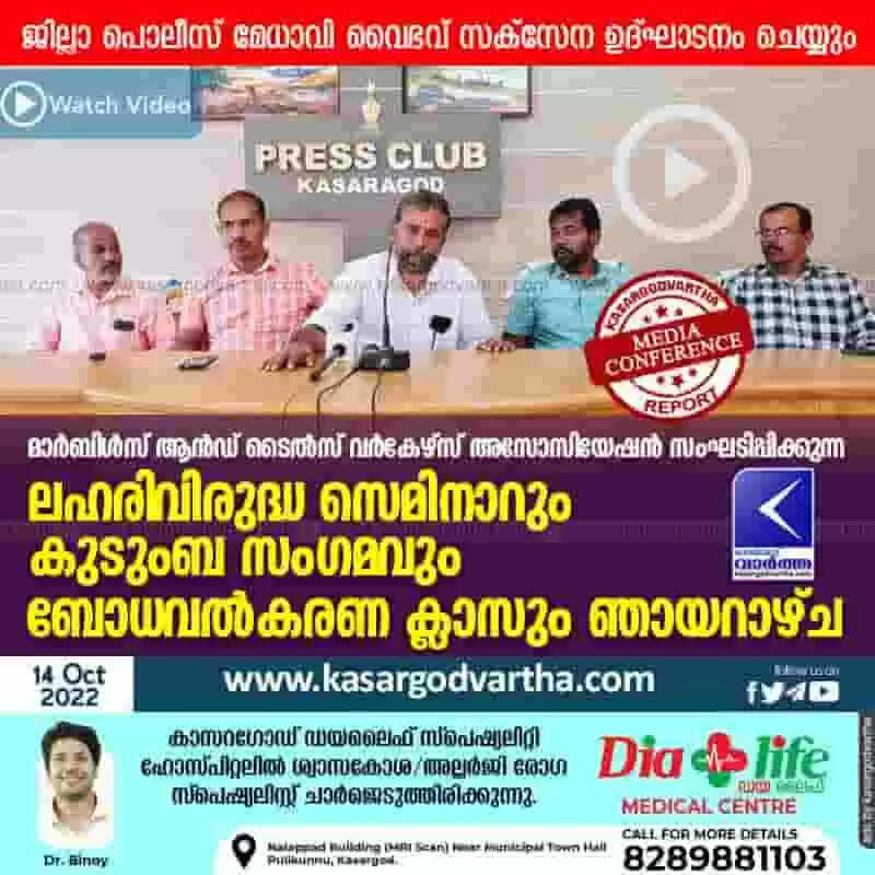 Keywords:  Latest-News, Kerala, Kasaragod, Top-Headlines, Press Meet, Anti-Drug-Seminar, Drugs, Police, Awareness, Marbles and Tiles Workers Association, Anti-drug seminar and awareness class organized by Marbles and Tiles Workers Association on Sunday.