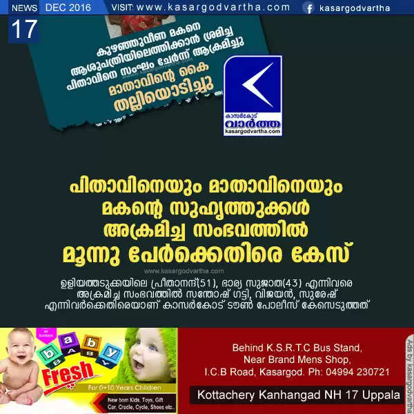 Keywords: Kasaragod, Kerala, Attack, case, father, Assault, complaint, Police, Assault: case against 3.