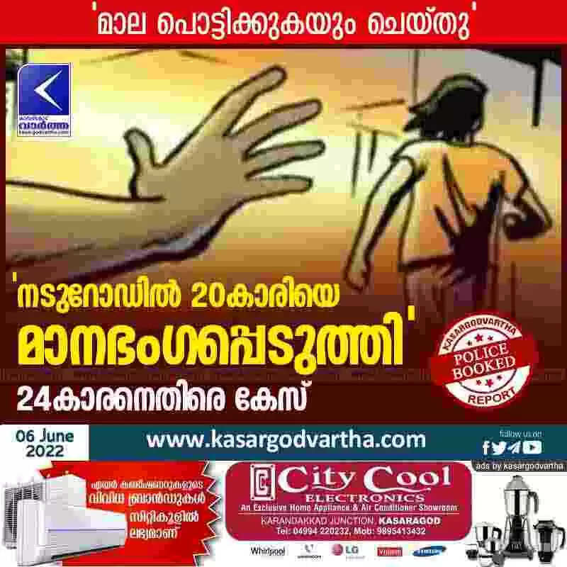 പള്ളിക്കര: (www.kasargodvartha.com) നടുറോഡില് 20 കാരിയെ മാനഭംഗപ്പെടുത്തി പാന്റിന്റെ പോകറ്റില് നിന്നും മൊബൈല് ഫോണ് എടുക്കുകയും മാല പൊട്ടിക്കുകയും ചെയ്തെന്ന പരാതിയില് 24 കാരനെതിരെ ബേക്കല് പൊലീസ് കേസെടുത്തു.