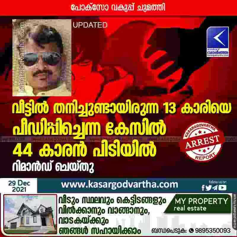 വീട്ടിൽ തനിച്ചുണ്ടായിരുന്ന 13 കാരിയെ പീഡിപ്പിച്ചെന്ന കേസിൽ 44 കാരൻ പിടിയിൽ; റിമാൻഡ് ചെയ്തു