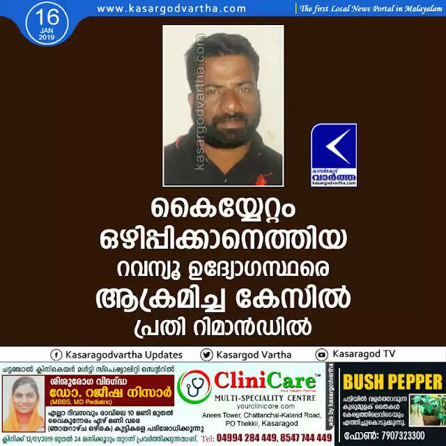 Keywords:  Attack against Revenue officers; One arrested, news, Kumbala, Attack, Arrest, Court, Remand, Police, Complaint, Kerala.