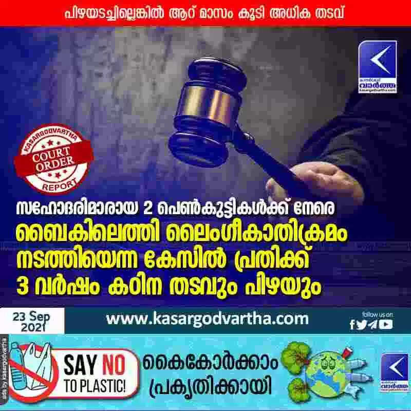 സഹോദരിമാരായ 2 പെൺകുട്ടികൾക്ക് നേരെ ബൈകിലെത്തി ലൈംഗീകാതിക്രമം നടത്തിയെന്ന കേസിൽ പ്രതിക്ക് 3 വർഷം കഠിന തടവും പിഴയും